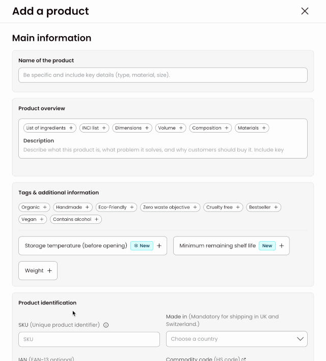- Fill in the required information so they can be correctly identified on the platform (storage temperature, minimum remaining shelf life at delivery)