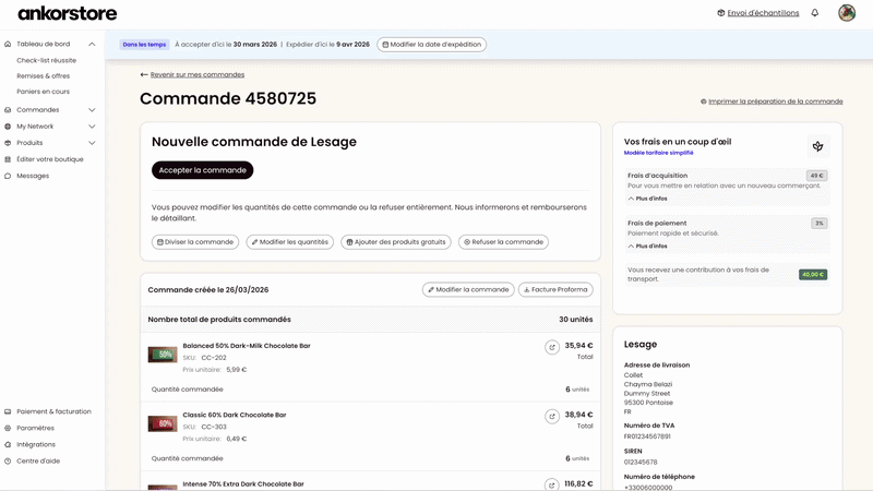 - Le commerçant est informé de ces modifications par e-mail et peut visualiser les changements dans le détail de sa commande