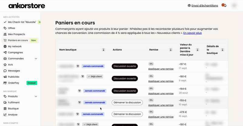 Identifiez en un coup d’œil les commerçants ayant ajouté vos produits à leur panier et relancez-les automatiquement grâce à l’IA pour accélérer la conversion.