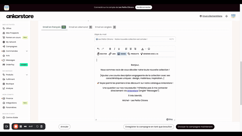- Personnaliser vos emails avec des visuels, CTA et liens vers Ankorstore