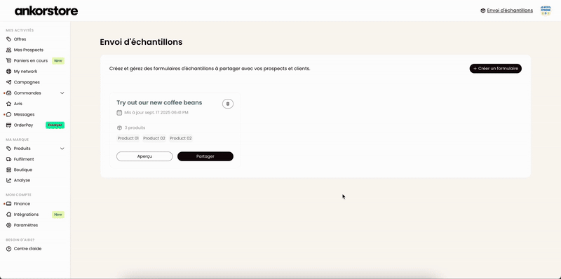 Créez et partagez facilement des formulaires de demande d’échantillons directement depuis votre back-office Ankorstore. Un moyen concret de susciter l’intérêt, renforcer la confiance et générer de nouvelles commandes.
